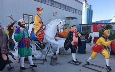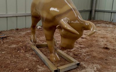首先在泡沫或泥塑外分割、噴涂隔離劑制作石膏模具;模具凝固后卸下并清理、精修模具;然后刷樹(shù)脂膠、貼纖維布開(kāi)始制作雕塑局部;待各個(gè)部分都制作好后拼裝到一起;最后打磨后進(jìn)行表面著色處理、噴涂清漆即可。
